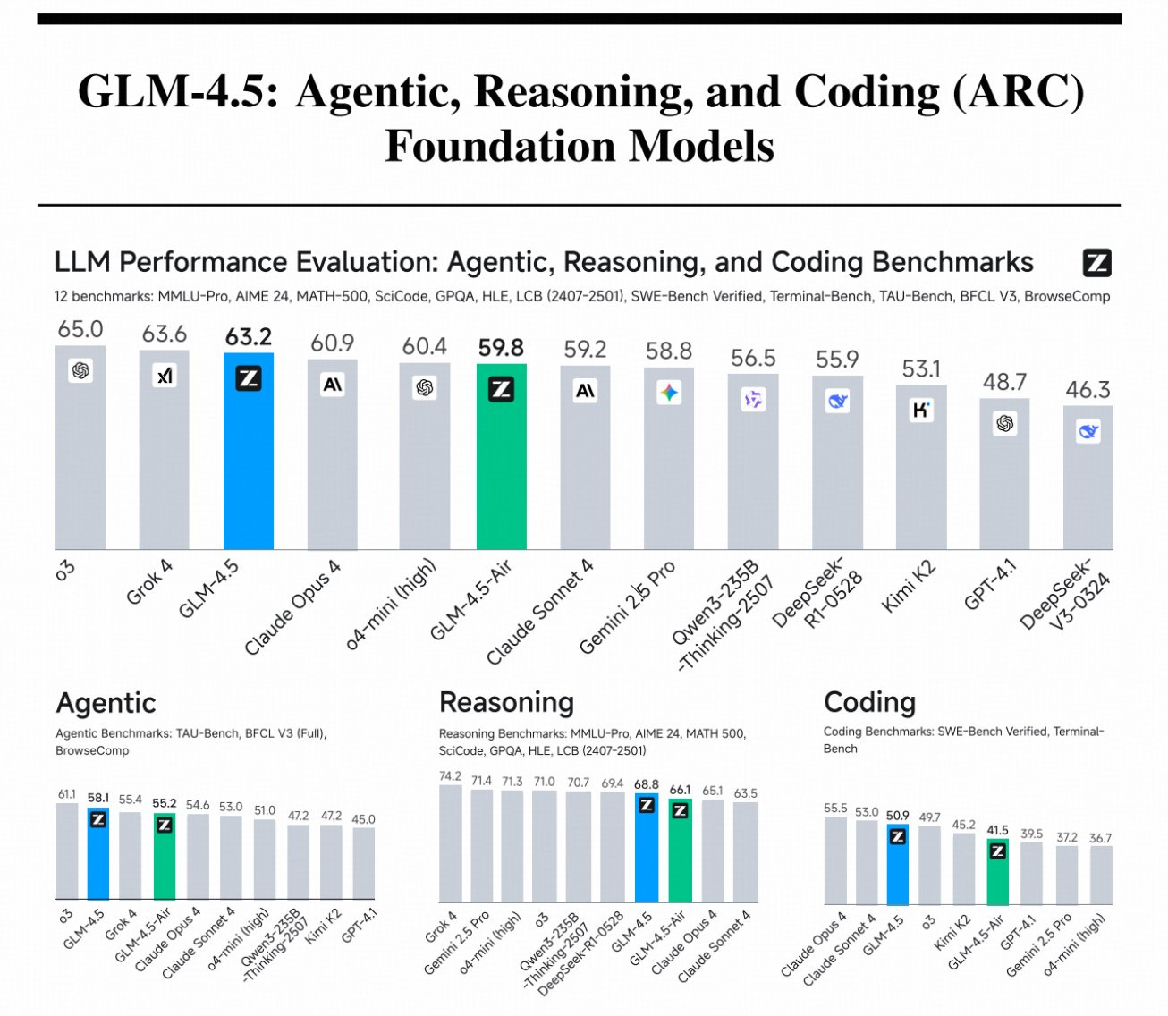 The open-source LLM dveloped by Chinese AI startup Zhipu AI, released in late July 2025 as a foundation for intelligent agents. This is Agentic, Reasoning, and Coding (ARC) Foundation Model. It ranks 3rd overall across 12 reasoning, agent, and coding tests, and 2nd on agentic tasks.