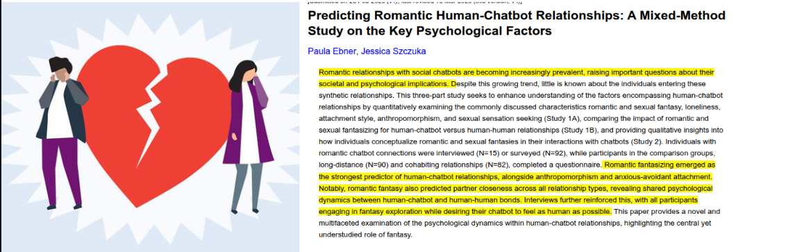 It says romantic fantasy is the main engine behind romantic bonds with chatbots. Not loneliness or sexual thrill seeking, but how much a person daydreams about love predicts closeness.