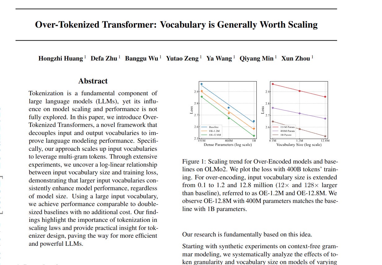 📌 Over-Tokenized Transformer offers a practical approach to improve LLMs. Tensor parallelism for embedding layers mitigates memory pressure from large vocabularies. This makes deploying larger input vocabularies feasible and efficient in practice.