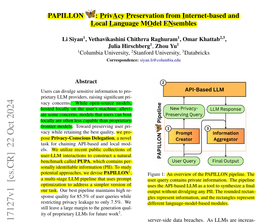 • PAPILLON: A multi-stage pipeline where local models act as privacy-conscious proxies