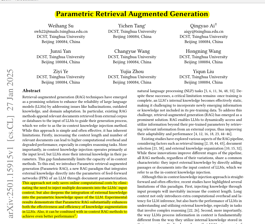 This paper introduces Parametric RAG. It injects external knowledge directly into the LLM's parameters. This is done by converting documents into a small set of parameters that are merged into the LLM's feed-forward networks.