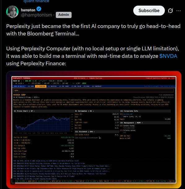 Perplexity just became the the first Al company to truly go head-to-head with the Bloomberg Terminal...