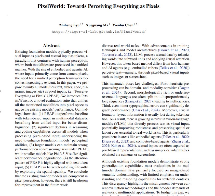 This paper proposes "Perceive Everything as Pixels" (PEAP). It evaluates models using PixelWorld, a new suite where all inputs are pixels, to test model performance across modalities.