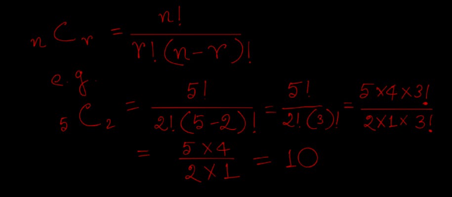 The combination of n different things taken r at a time is denoted by nCr and used the formula for calculation is below