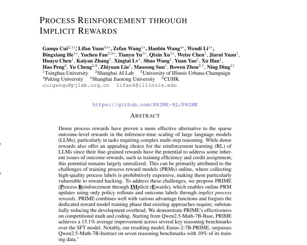 This paper introduces PRIME, a method for Process Reinforcement through Implicit Rewards. PRIME uses implicit process rewards derived from an online-updated reward model. This approach bypasses the need for expensive process labels and reduces reward hacking risks in online LLM reinforcement learning.