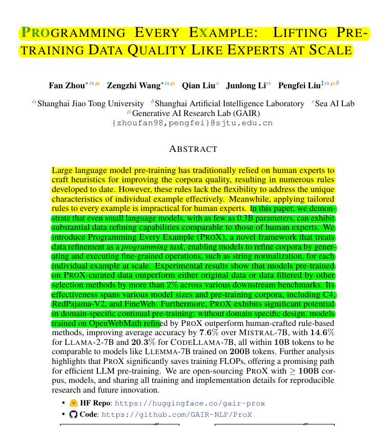 Introduces Programming Every Example (ProX), a framework using small language models (0.3 billion parameters) for data refinement.