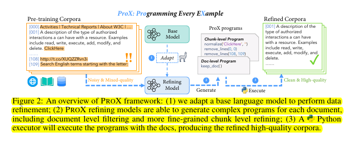 ProX adapts small base models to refining tasks through fine-tuning, generating programs for each example in the corpus.