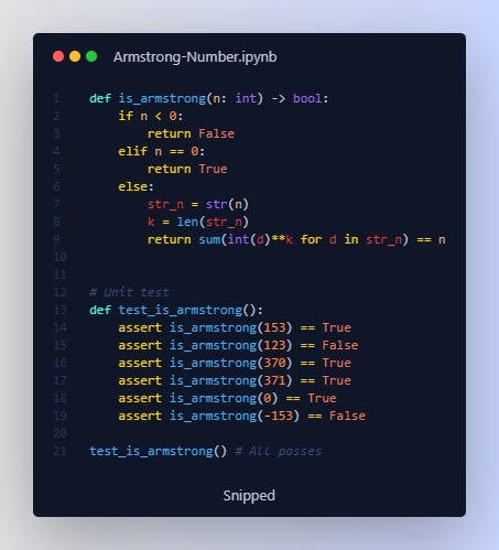 Finally, we compare this sum to the original number n. If they're equal, n is an Armstrong number and the function returns True; otherwise, it returns False.