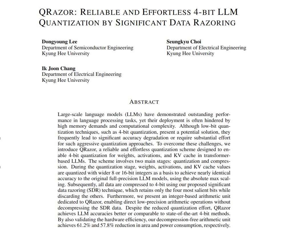 📌 QRazor uses a smart two-stage quantization. It first employs 8-bit and 16-bit integers with Absolute Max Scaling to preserve outlier data, before Significant Data Razoring compresses to 4-bit.