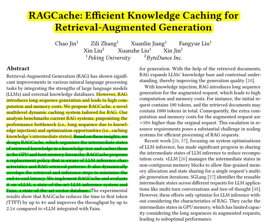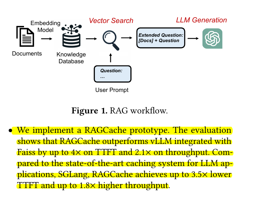 • RAGCache introduces a multilevel dynamic caching system that caches intermediate states of retrieved documents across multiple requests