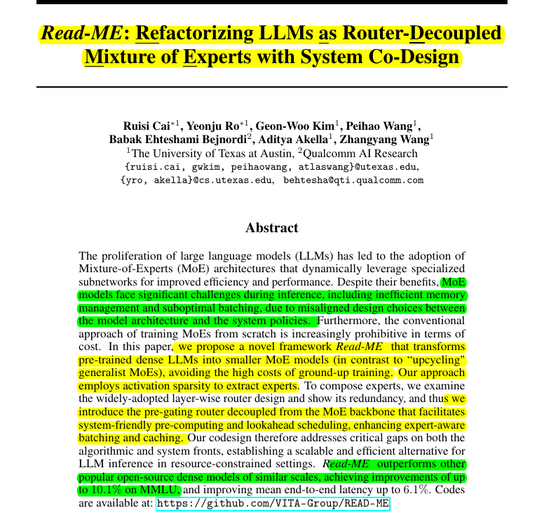 • Introduces Read-ME: transforms pre-trained dense LLMs into smaller MoE models using activation sparsity