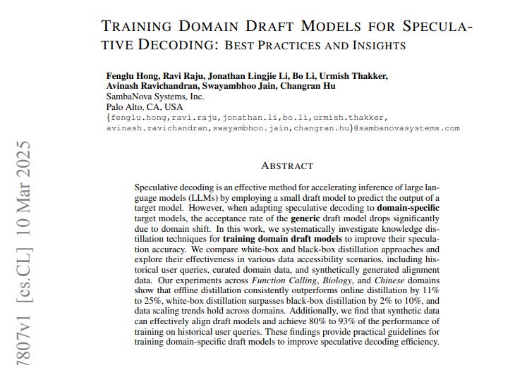 Speculative decoding has emerged as an effective method for accelerating inference in large language models, but its effectiveness diminishes when applied to domain-specific models due to domain shift. In March 2025, Hong et al. from SambaNova Systems addressed this challenge in their paper "Training Domain Draft Models for Speculative Decoding: Best Practices and Insights".