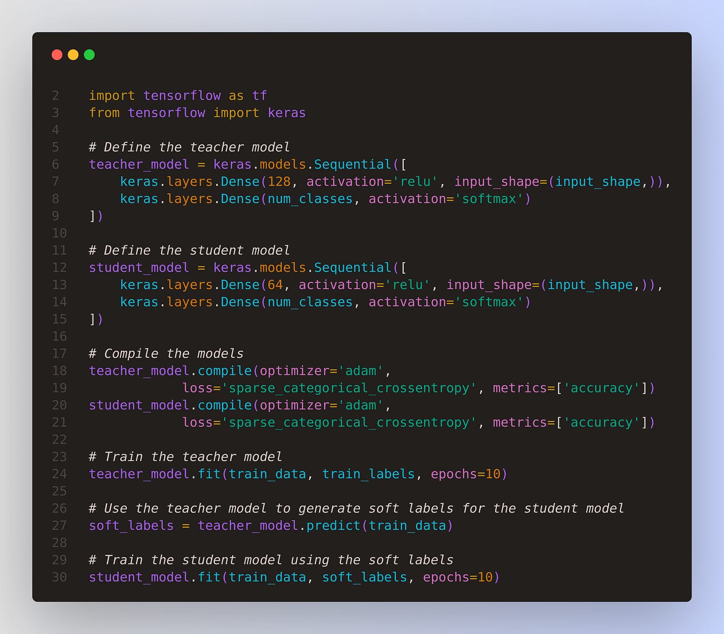 Custom Loss Functions: PyTorch's dynamic computational graph makes it straightforward to implement complex distillation loss functions. A typical implementation combines: