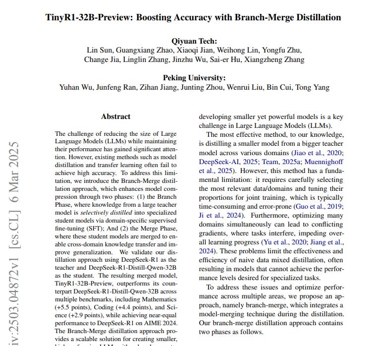 A significant innovation in distillation techniques emerged in March 2025 with the introduction of the Branch-Merge distillation approach by researchers at Qiyuan Tech and Peking University. Their paper "TinyR1-32B-Preview: Boosting Accuracy with Branch-Merge Distillation" presents a novel two-phase approach to enhance model compression: