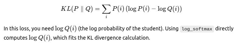 The KL divergence (specifically, the forward KL divergence here) is computed by taking the expectation of the student’s log probability under the teacher’s probability distribution. Minimizing this loss encourages the student to adjust its output so that it becomes similar to the teacher's. Essentially, the student is "learning" to output probabilities close to the teacher’s.When computing KL divergence, the formulation requires the log of the student’s predicted probabilities. Here’s why using log_softmax for the student is preferred over applying softmax followed by a logarithm.