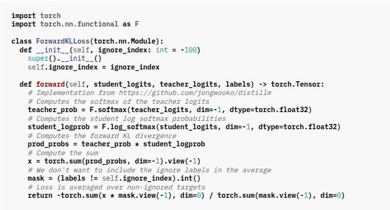 Hence The key loss function used in this KD approach is the Forward KL Divergence Loss, which measures the difference between the teacher’s and student’s output distributions. Here’s a simplified version of the implementation: