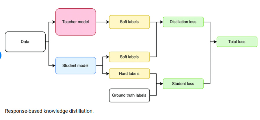 Response-based distillation: The student model learns to mimic the output probabilities (soft targets) produced by the teacher model, rather than just the hard class labels. These soft targets contain richer information about similarities between classes that aren't captured in one-hot encoded ground truth labels. Response-based knowledge distillation focuses on the final output logits. Here, the teacher’s prediction is transformed into a “soft target” distribution using a softmax function with an elevated temperature T.