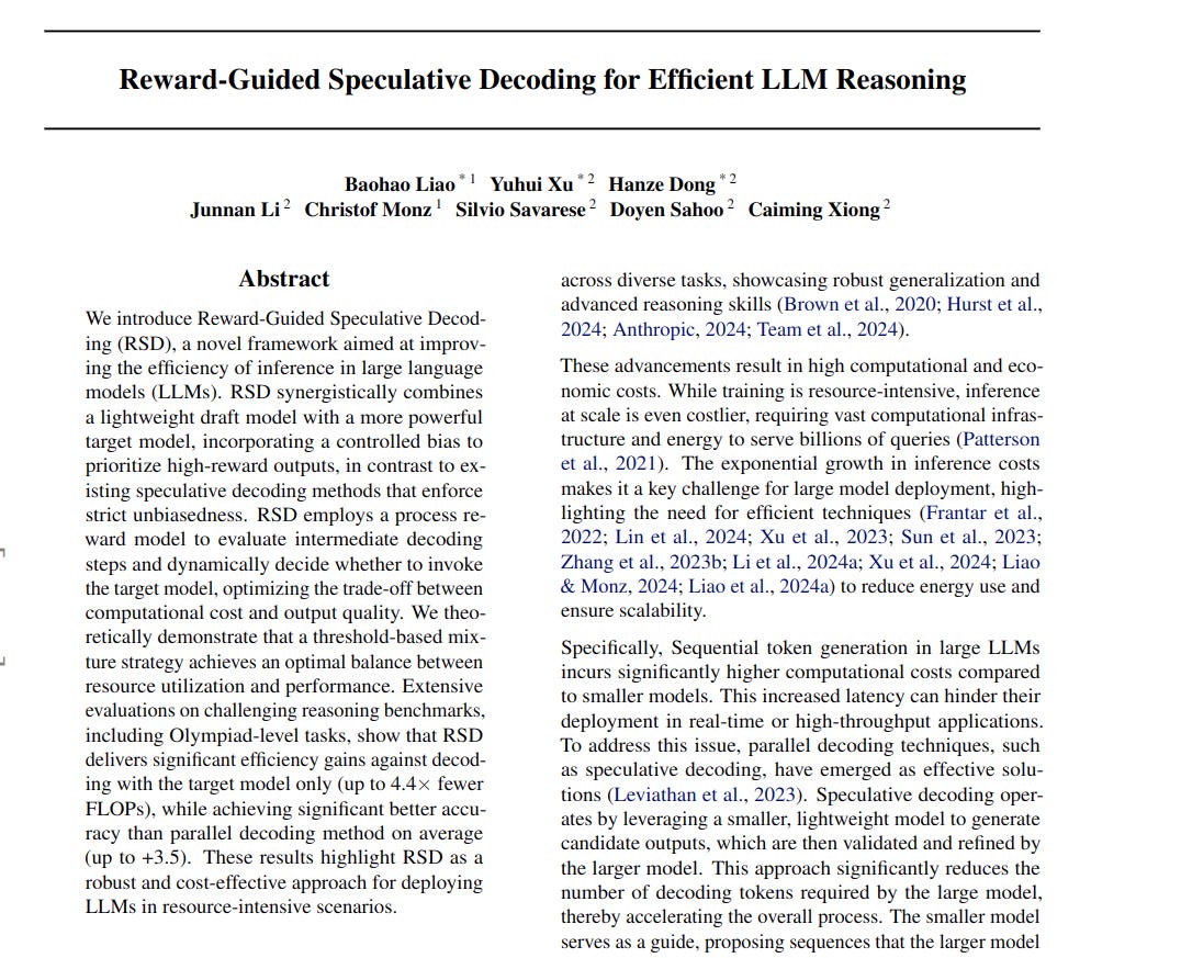 This paper proposes Reward-Guided Speculative Decoding (RSD). RSD uses a smaller draft model and a larger target model. A reward model guides the selection of outputs from these models to optimize efficiency and accuracy.