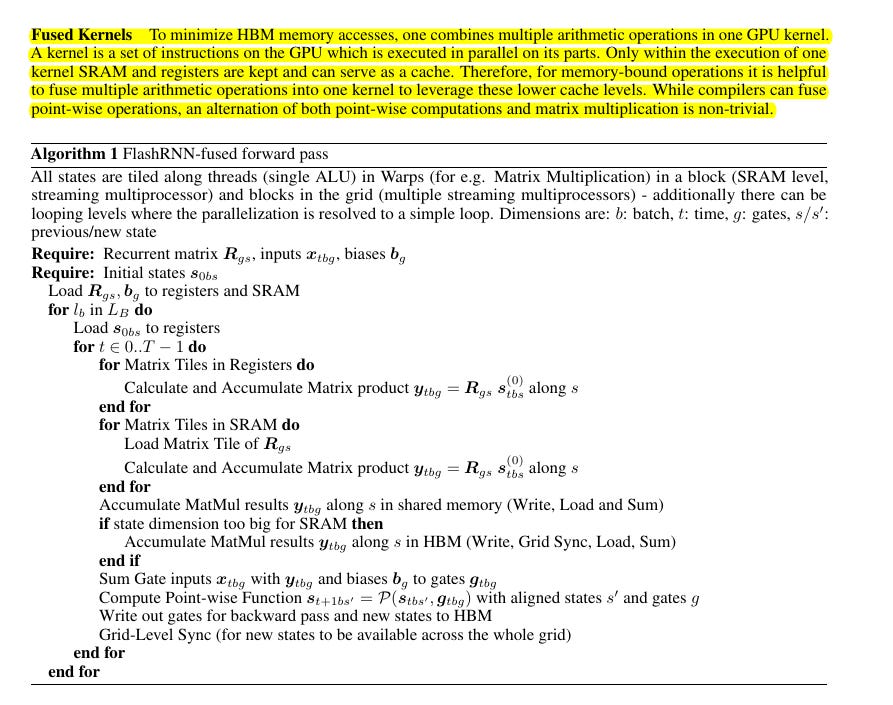 The "fused kernel" for the forward pass processes the input sequence in a loop, step-by-step through time. Instead of alternating between separate operations for matrix multiplication and activations, everything is packed into one kernel.