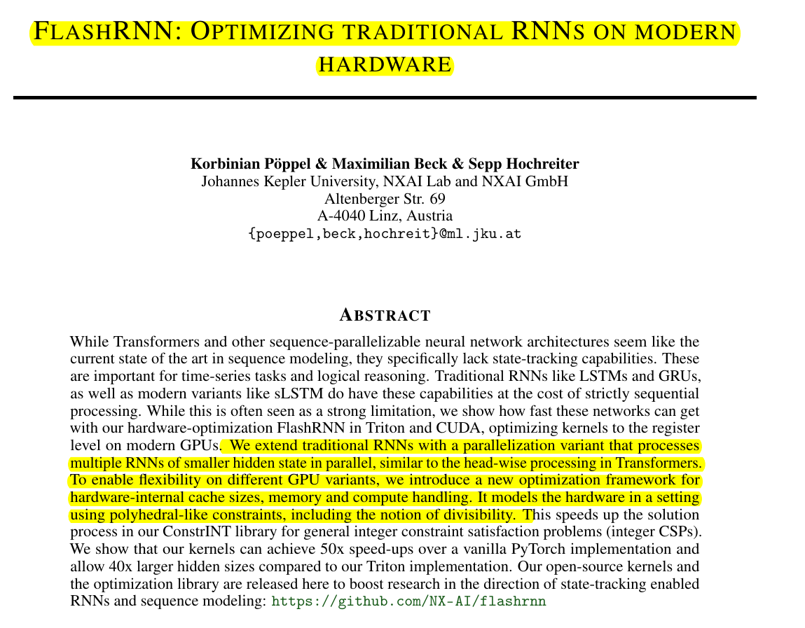 FlashRNN introduces a way to optimize traditional Recurrent Neural Networks (RNNs) like LSTMs (Long Short-Term Memory) and GRUs (Gated Recurrent Units) for modern GPUs by improving how computations are parallelized and how memory is managed. Despite the hype around Transformers, RNNs remain unbeatable in state-tracking tasks like time-series predictions and logic-related tasks. The challenge is their strict sequential processing, which makes them slow. FlashRNN aims to fix this without changing the core RNN design.