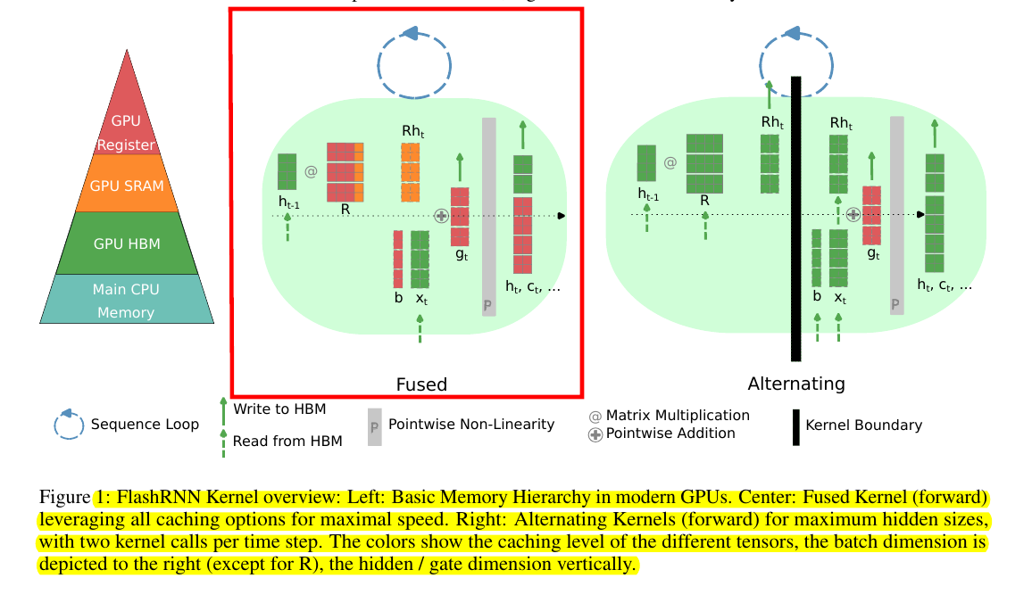 This image from the presents a breakdown of GPU memory hierarchy and the concept of fused versus alternating kernels in the FlashRNN model, highlighting how different approaches to computation and memory usage can impact performance.
