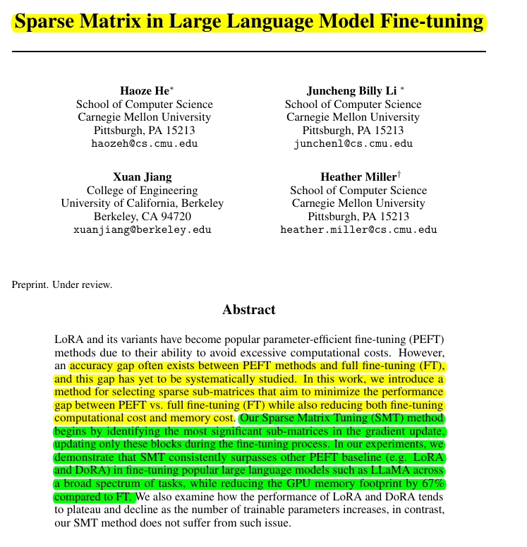• Introduces Sparse Matrix Tuning (SMT) that identifies and fine-tunes only critical sub-matrices
