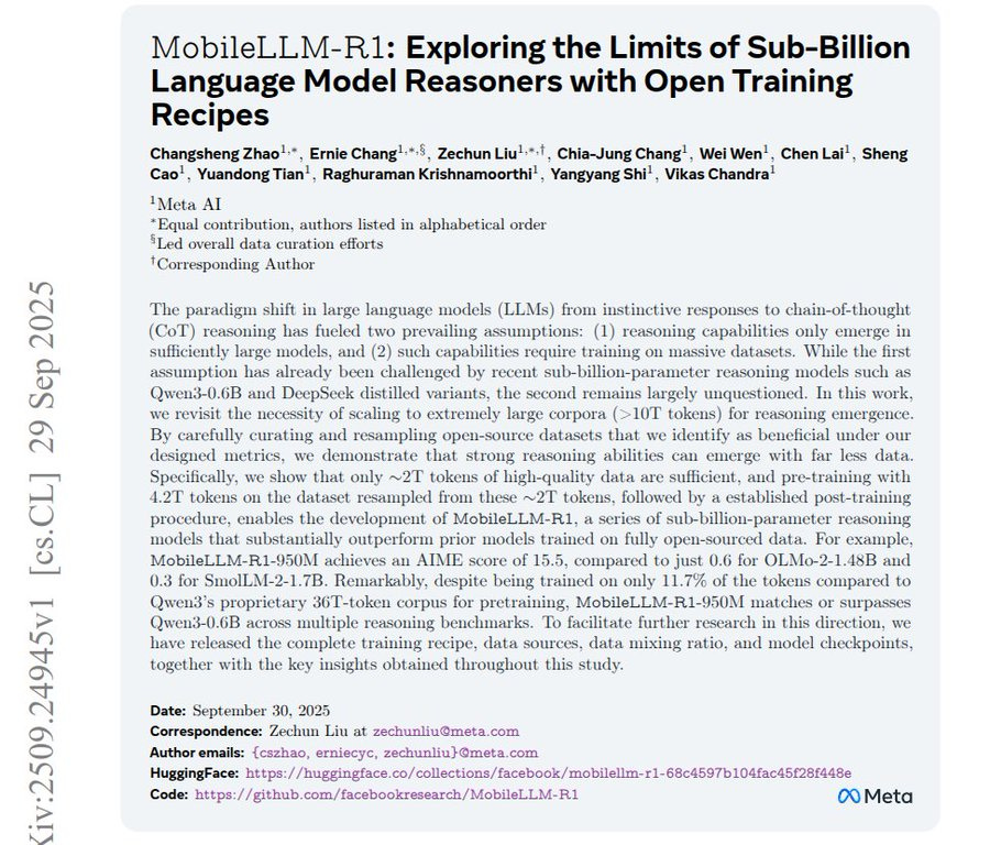 👨🔧 MobileLLM-R1: Exploring the Limits of Sub-Billion Language Model Reasoners with Open Training Recipes