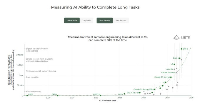 METR’s long horizon autonomy tests and OpenAI’s GDPval benchmark, clearly shows models already do around 50% of skilled tasks and are on pace to work independently for 8 hours by mid 2026. A massive step change in everyday productivity is very close, because exponential curves often surprise late.
