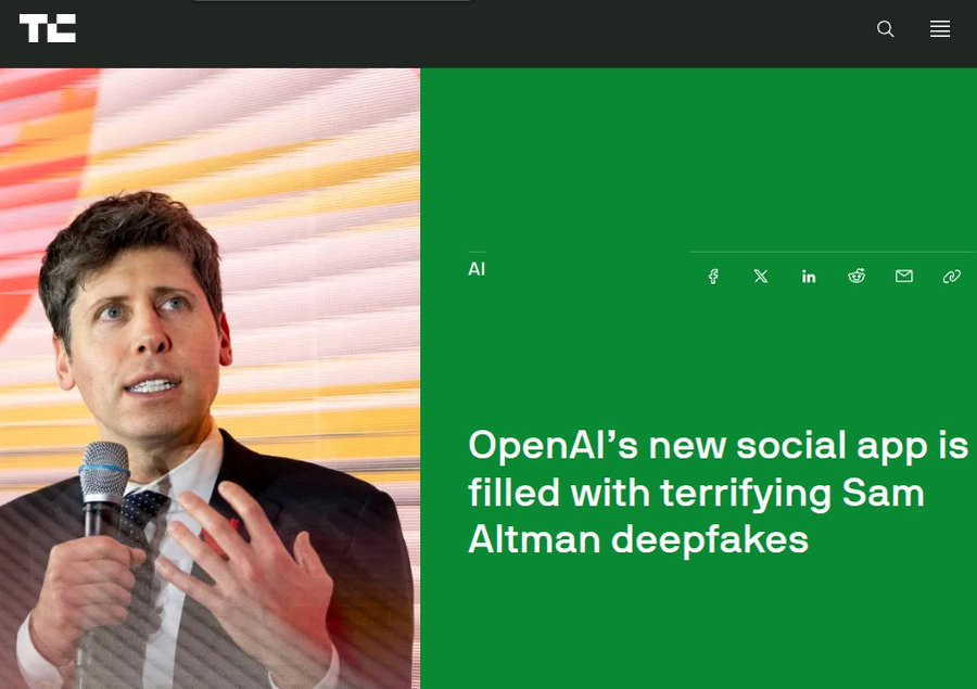 🏆 🎥 OpenAI’s Sora app is already filled with hyper realistic Sam Altman deepfakes made through its built in cameo system.