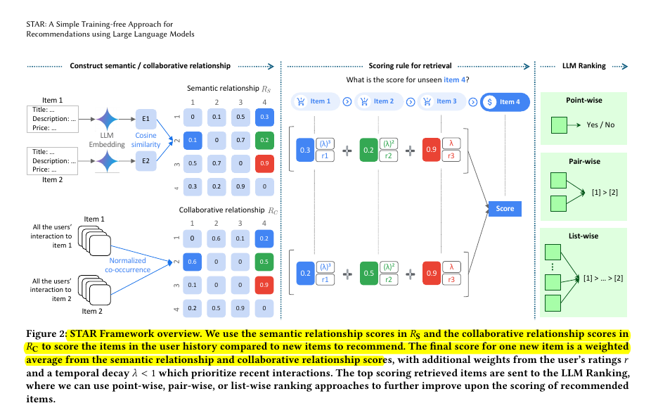 Retrieval stage uses LLM embeddings for semantic similarity plus collaborative user data