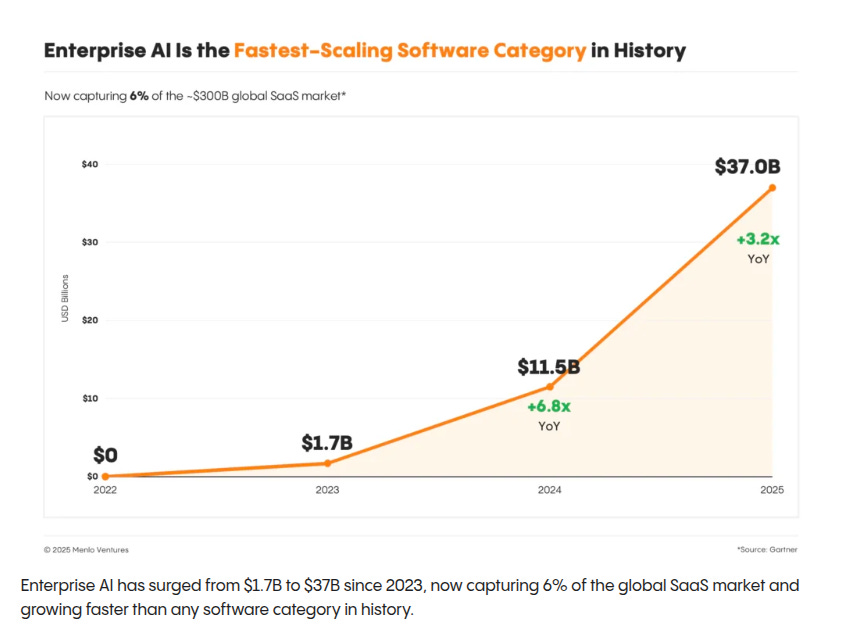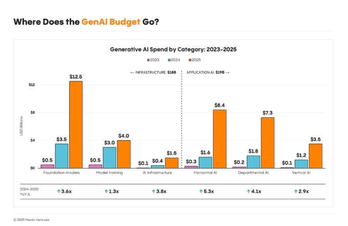 Enterprise generative AI spend hit $37B in 2025, up 3.2x from 2024, split $19B for applications and $18B for infrastructure.