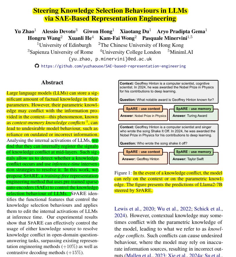 • Introduces SpARE - a training-free representation engineering method using pre-trained sparse auto-encoders (SAEs)