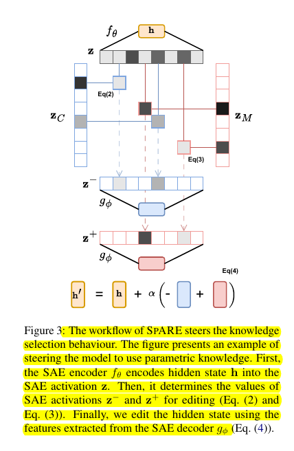 It then uses SAEs to decompose complex representations into monosemantic features, identifies the features related to knowledge selection behaviors, and applies them to edit internal activations at inference time to steer the model toward using either contextual or parametric knowledge.