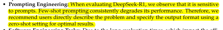 → In their experiments, few-shot prompting consistently degraded DeepSeek-R1's performance.