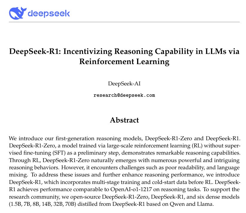 RL-Driven Reasoning: The paper emphasizes that DeepSeek-R1 (and especially DeepSeek-R1-Zero) are trained primarily using Reinforcement Learning (RL) to incentivize reasoning capabilities. This is a key differentiator. Unlike models heavily reliant on Supervised Fine-Tuning (SFT) which learn patterns from vast datasets of input-output pairs, DeepSeek-R1's reasoning skills are more intrinsically developed through interaction with a reward function.
