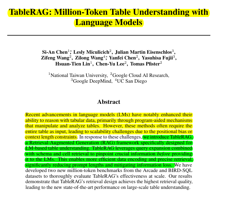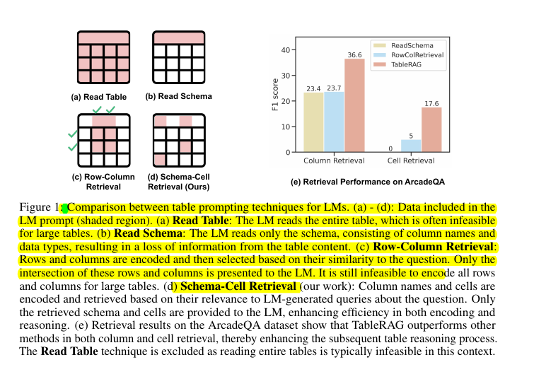 • TableRAG introduces a novel retrieval framework combining schema and cell retrieval