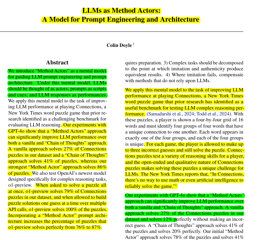 Researchers introduce "Method Actors" framework for LLM prompt engineering, achieving 86% success rate in solving complex word puzzles through novel approach treating LLMs as performers rather than thinkers.