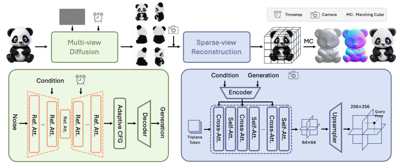 → Hunyuan3D 2.0 integrates two primary components: Hunyuan3D-DiT, a shape-generation model utilizing diffusion transformers, and Hunyuan3D-Paint, a texture synthesis model leveraging multi-view geometry and diffusion techniques. Together, they ensure seamless generation of detailed, textured 3D assets.