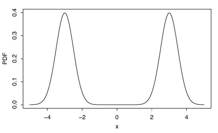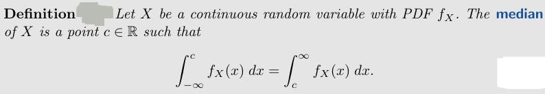These are three statistical quantities that we are frequently interested in: mean, mode, and median. We all know how to compute these from a dataset. For example, to compute the median of a dataset, we sort the data and pick the number that sits in the 50th percentile. However, the median computed in this way is the empirical median, i.e., it is a value computed from a particular dataset. If the data is generated from a random variable (with a given PDF), how do we compute the mean, median, and mode?
