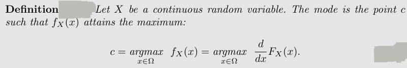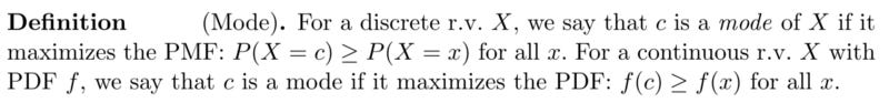 Intuitively, the median is a value c such that half the mass of the distribution falls on either side of c (or as close to half as possible, for discrete r.v.s), and the mode is a value that has the greatest mass or density out of all values in the support of X. If the CDF F is a continuous, strictly increasing function, then