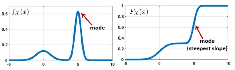 And in the Right figure, the mode appears at the steepest slope of the CDF.