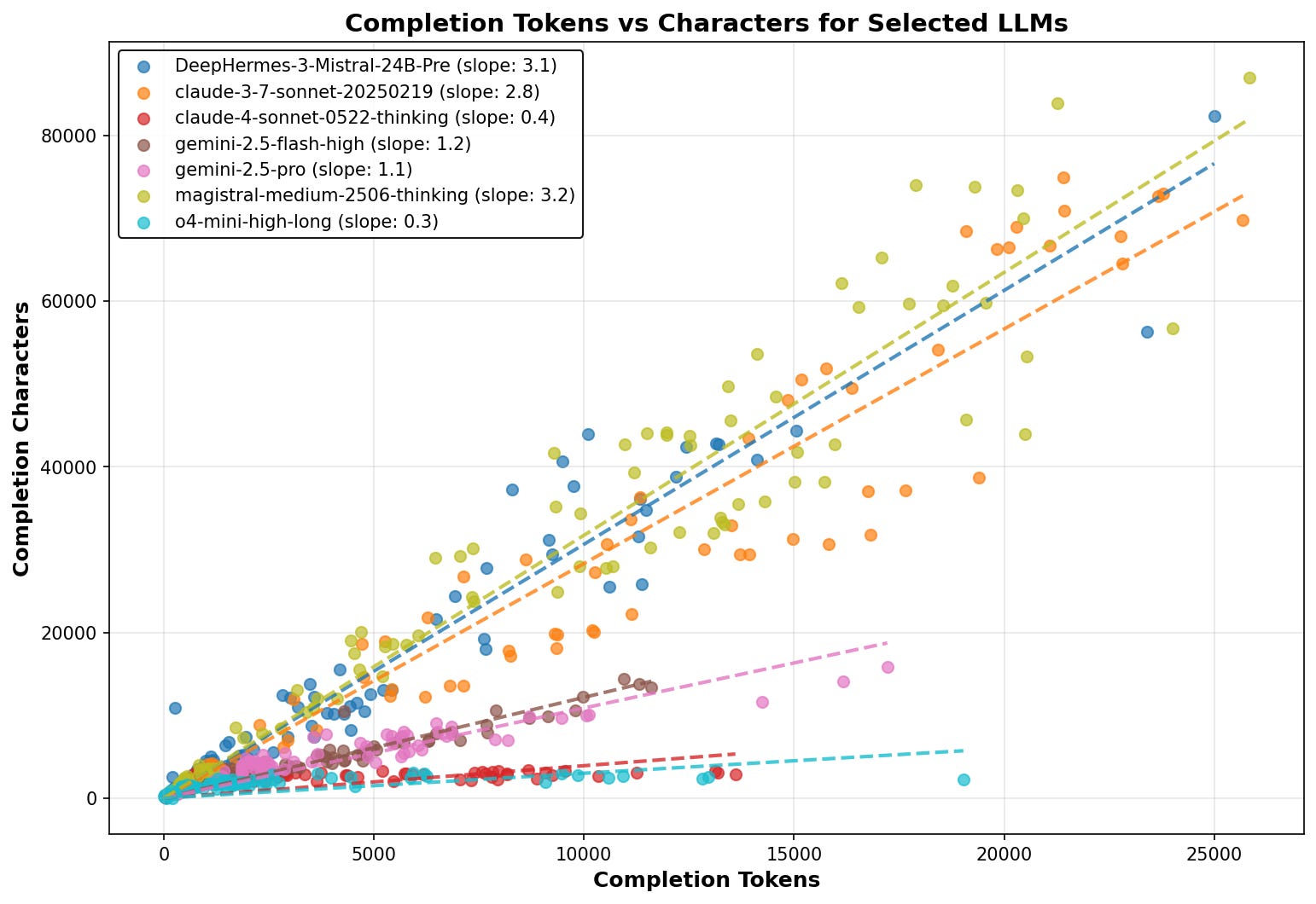 Closed models often hide raw chain-of-thought. The team checked the relationship between characters and billed tokens to spot who is compressing reasoning versus printing it verbatim. They found distinct slopes by provider, which implies some models summarize their reasoning while others output it fully. Because billing keys off completion tokens either way, that metric remains comparable across vendors. Tests ran with a 30,000 token cap and N=5 samples per prompt to smooth randomness.
