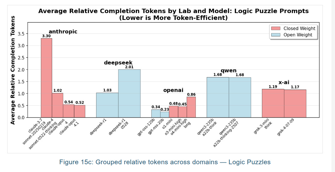Closed leaders, including OpenAI and xAI’s grok-4, trend toward fewer tokens across workloads. On the open side, llama-3.3-nemotron-super-49b-v1 is the strongest token miser, while some newer open families show unusually high token usage. The new gpt-oss models are notable because they are open-weight yet still very efficient, and they expose reasoning traces that others compress or hide. OpenAI confirms gpt-oss-120b and gpt-oss-20b are MoE models with accessible chain-of-thought, which lines up with the study’s observations.