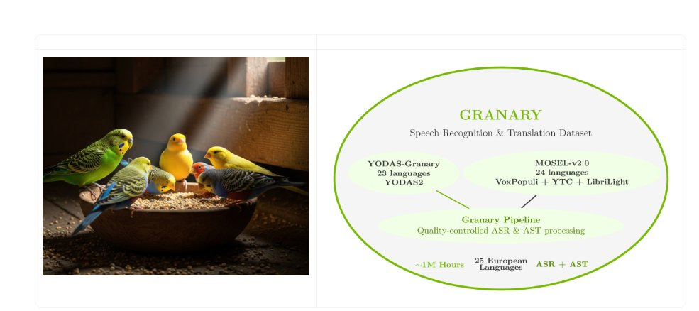 NVIDIA released Granary, a ~1M-hour open dataset across 25 European languages, plus Canary-1b-v2 and Parakeet-tdt-0.6b-v3, raising the bar for open ASR and speech translation. The stack targets fast, production-grade transcription and translation for both high and low-resource European languages.