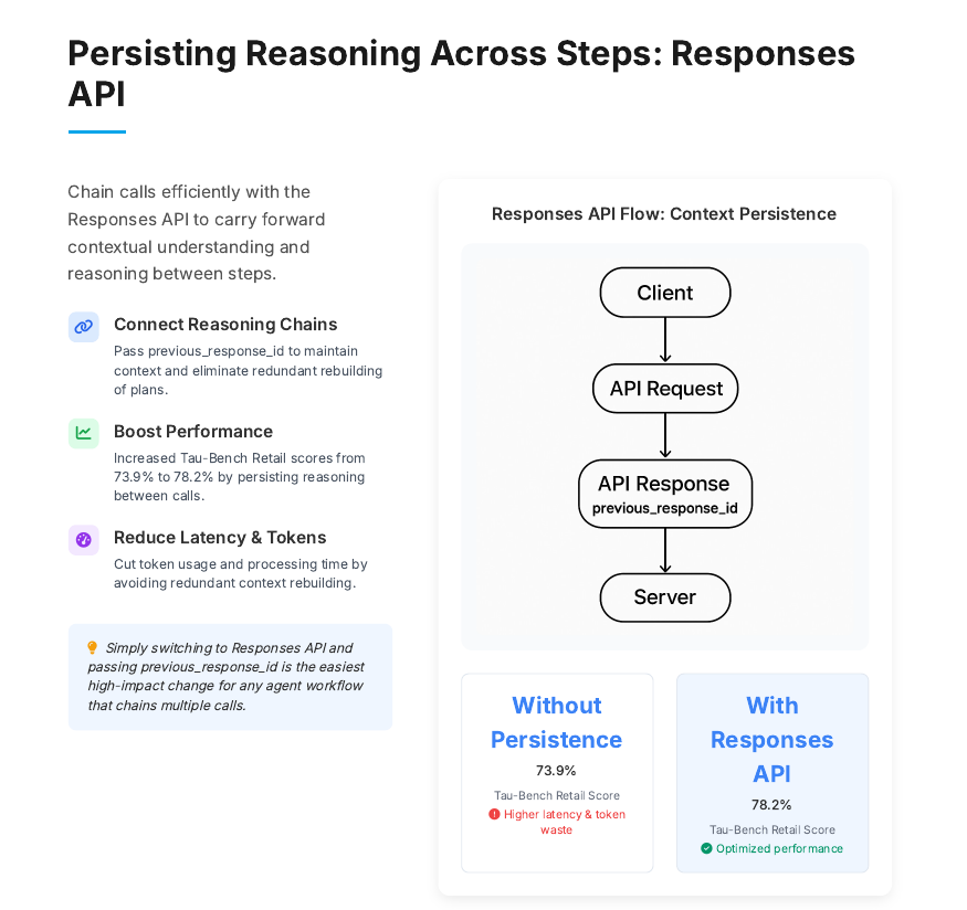 Pass `previous_response_id` to reuse past thoughts and cut latency.