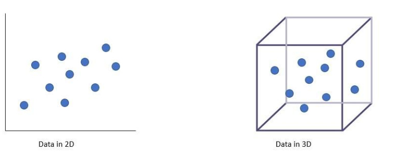 The image below illustrates how the same number of data points looks dense in 2D but sparse in 3D. Imagine the sparsity in higher dimensions!