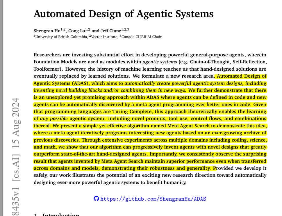 • Introduces Automated Design of Agentic Systems (ADAS), a new research area for automatic creation of powerful agentic system designs