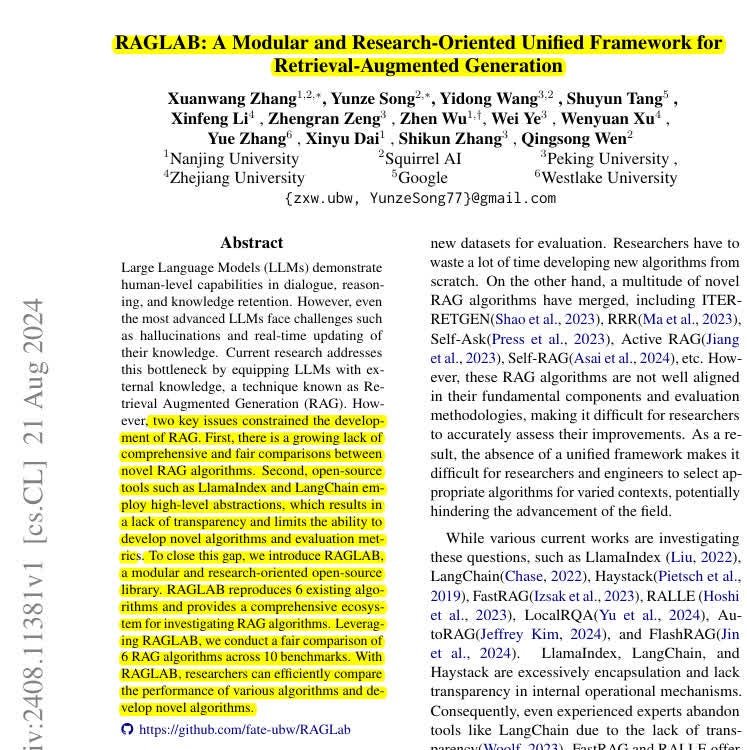 • Introduces RAGLAB, an open-source library for RAG research • Features:
