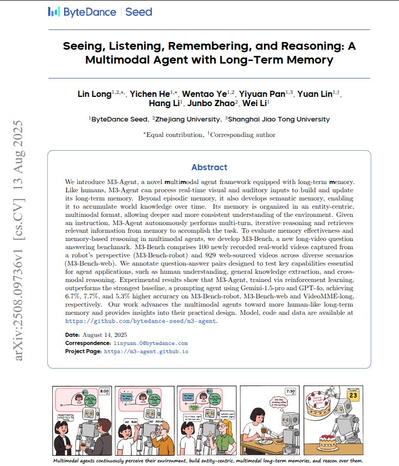 It introduces M3-Agent, which runs 2 loops, memorization builds long term memory, control reasons over it. Memorization turns the live video and audio stream into 2 kinds of memory, episodic events and semantic facts.