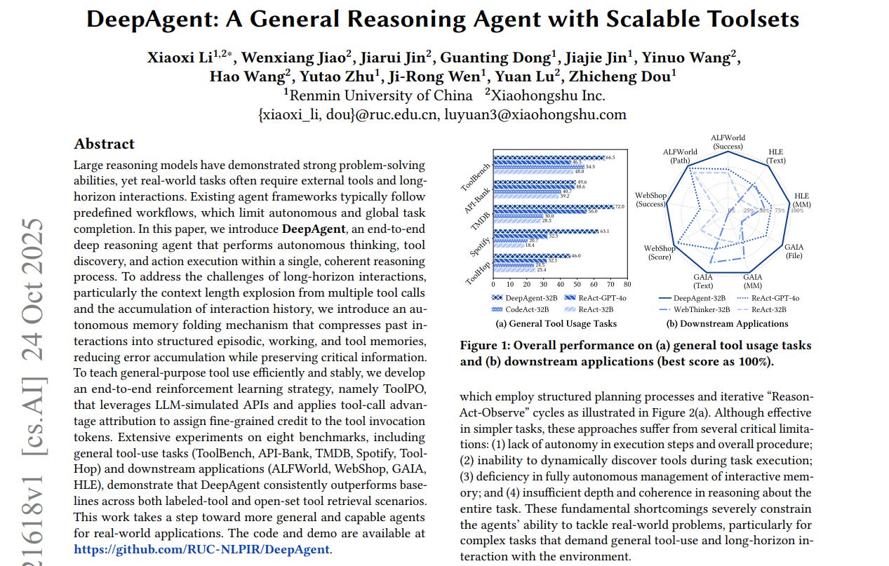 The paper introduces DeepAgent, lets a reasoning model find tools on demand, manage memory, and beat workflow agents on hard, long tasks.